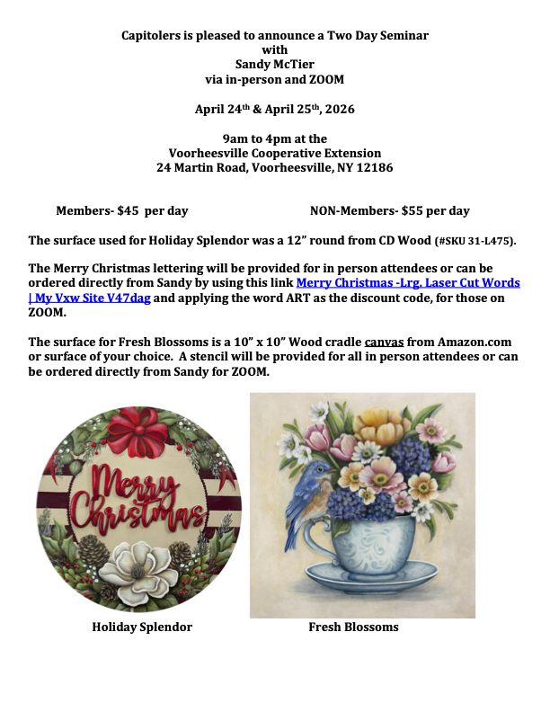 Sandy McTier is coming in person (and we’ll be zooming!) Friday, 4/24 and Saturday, 4/25! Hope you can join us for fun, food and painting! Sign up now!